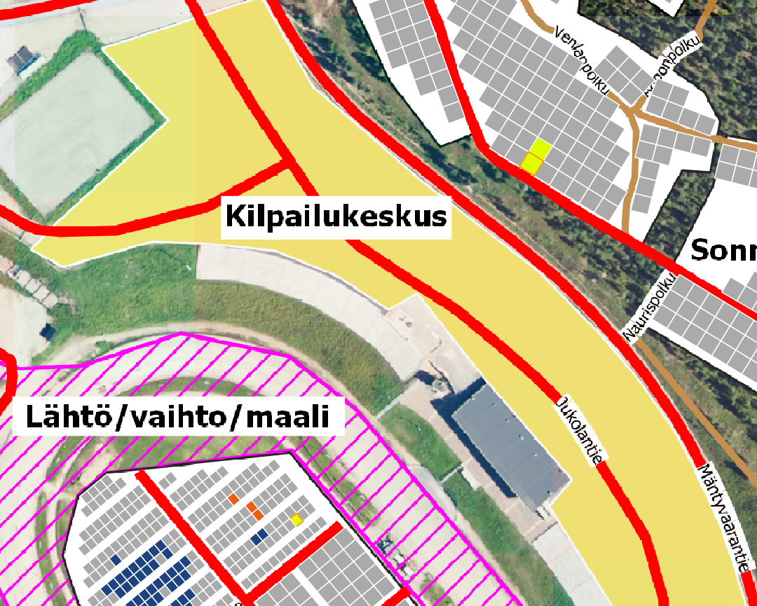 Koko kilpailukeskuksen kartta löytyy järjestäjien kisasivuilta https://jukola.com/2021/kilpailijat/kilpailuohjeet/.